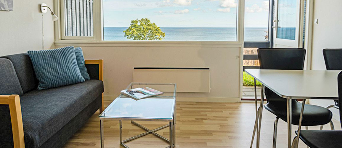 Ferielejlighederne er indrettet med entre og lyst køkken. Fra entreen er der indgang til pænt og lyst badeværelse samt stue med spisebord, sofastole og soveafdeling med to senge. Sæt dig i stuen og nyd den flotte havudsigt, eller slap af på den skønne terrasse med terrassemøbler, hvor du også kan nyde udsigten over Østersøen.